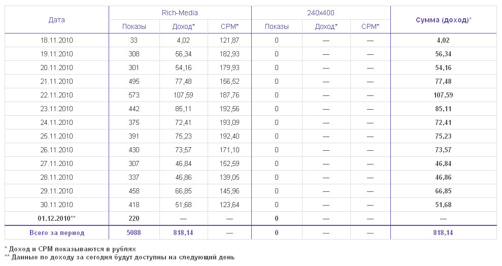 На один из своих блогов на тему блоггинга я установил баннер от Rotaban – шапка, размеры 468х60, 13526 показов за 30 дней – продано за 250р. То есть в день приблизительно 13526/30=450 уников. И еще цифры 250/30=8,3р в день.