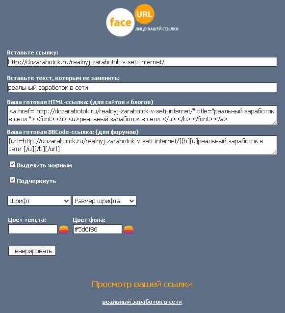 Например, мне необходимо текст реальный заработок в сети сделать ссылкой для адреса http://dozarabotok.ru/realnyj-zarabotok-v-seti-internet/. Ввожу данные как на рисунке, выбираю шрифт текста, цвет, фон, нажимаю на кнопку Генерировать и получаю соответствующие коды. После вставки на мой блог получил такую ссылку.