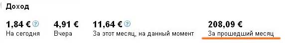 Теперь покажу, что я имею из этого блога. Главный доход идет из контекстной рекламы Гугла. За январь 2012 года я заработал 208,09 евро, это приблизительно 8 300 руб.