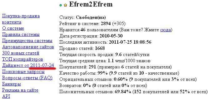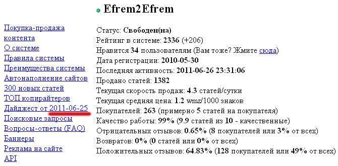 Итак на фото ниже изображен скрин статистики копирайтера Efrem2Efrem за 2011-06-26 (подчеркнутая дата 2011-06-25 потому что Текстсейл обновляет дайджест за прошлый день). На тот момент было продано 1382 статей при средней цене 1,2 $/1000 знаков. Следующий скрин статистики я сделал 2011-07-25, то есть через месяц. Как видим количество проданных статей составляет уже 1668. Считаем 1668 – 1382=286 проданных статей за месяц. Средний размер статей в этого копирайтера 3000 знаков. Тогда получим, что цена одной проданной статьи составляет 1,2$*3,000=3,6$.