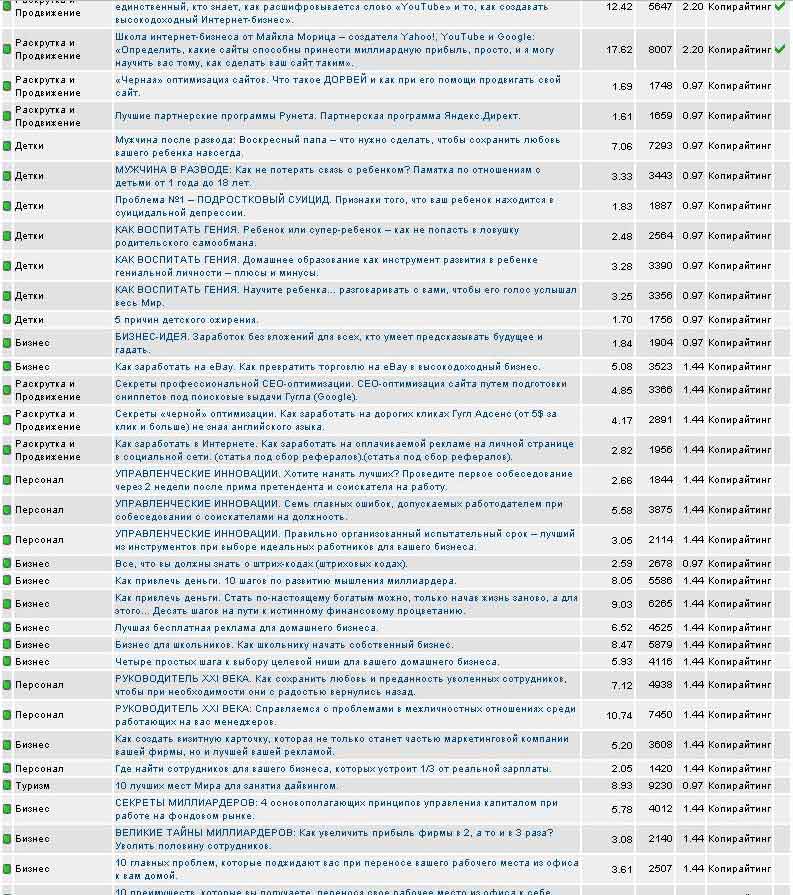 Для примера покажу фрагмент списка статей, выставленных на продажу в нашего копирайтера Efrem2Efrem (всех статей у него держится где-то больше сотни). Также обратите внимание на заглавия статей – они дают большой объем информации, бросаются в глаза и заинтересовывают. Думаю также замечательный пример хорошего написания заглавий. Для увеличения кликните по изображению.