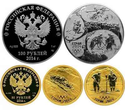 Неотъемлемой частью истории олимпийских денег является выпуск более 40 различных монет, входящих в серию «Сочи - 2014». Первыми из серии были выпущены монеты номиналом в три рубля, сделанные из серебра, под названием «Хоккей», «Фигурное катание», «Биатлон», «Горные лыжи», а также купюра в тысячу рублей «Флора Сочи». В 2012 году были созданы восемь монет из золота и серебра, под названием «Сноубординг», «Прыжки на лыжах», «Фристайл» и «Скелетон». Данные монеты были выпущены в номиналах 3, 50, а также 100 рублей. Естественно, вскоре были воссозданы другие зимние виды спорта, а также монеты с традиционными русскими развлечениями. Стоящими экземплярами являются прямоугольные монетки с Мишкой, а также монеты «Прометей» и «Мацеста». Последние монеты отличаются весом в два килограмма, и номиналом в 10 000 рублей.